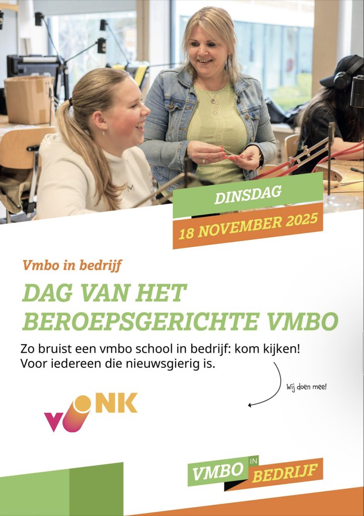 Altijd al eens een kijkje willen nemen in de school die midden in onze wijk staat? Dit is uw kans! U bent van harte welkom op 18 november tussen 09.00 en 12.00 uur. Aanmelden kan via deze link: Vmbo in bedrijf | Vonk