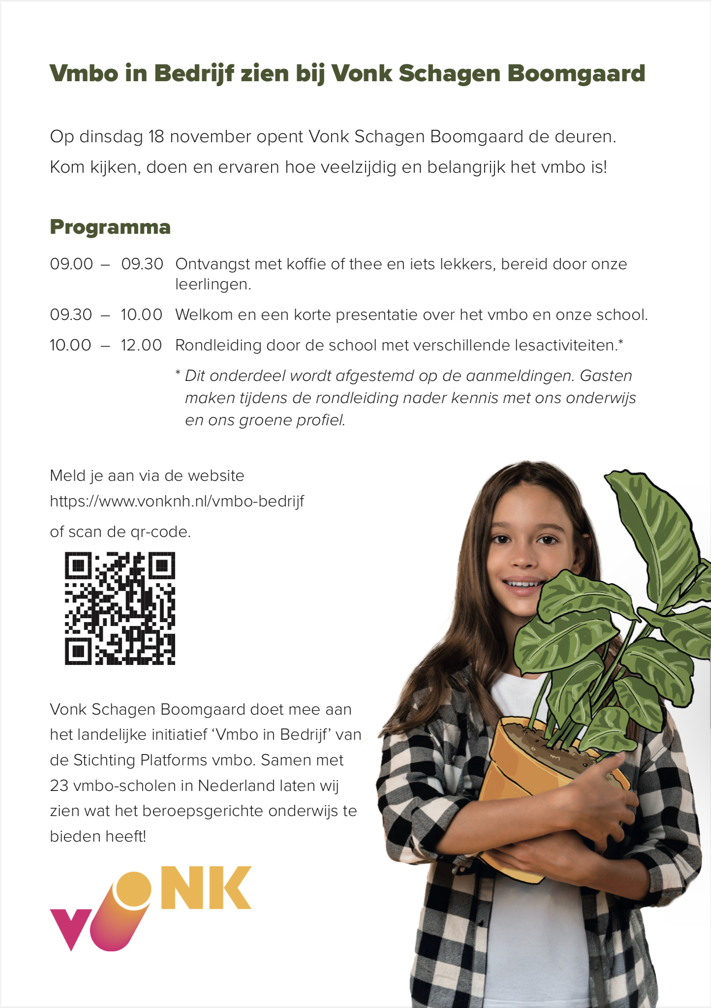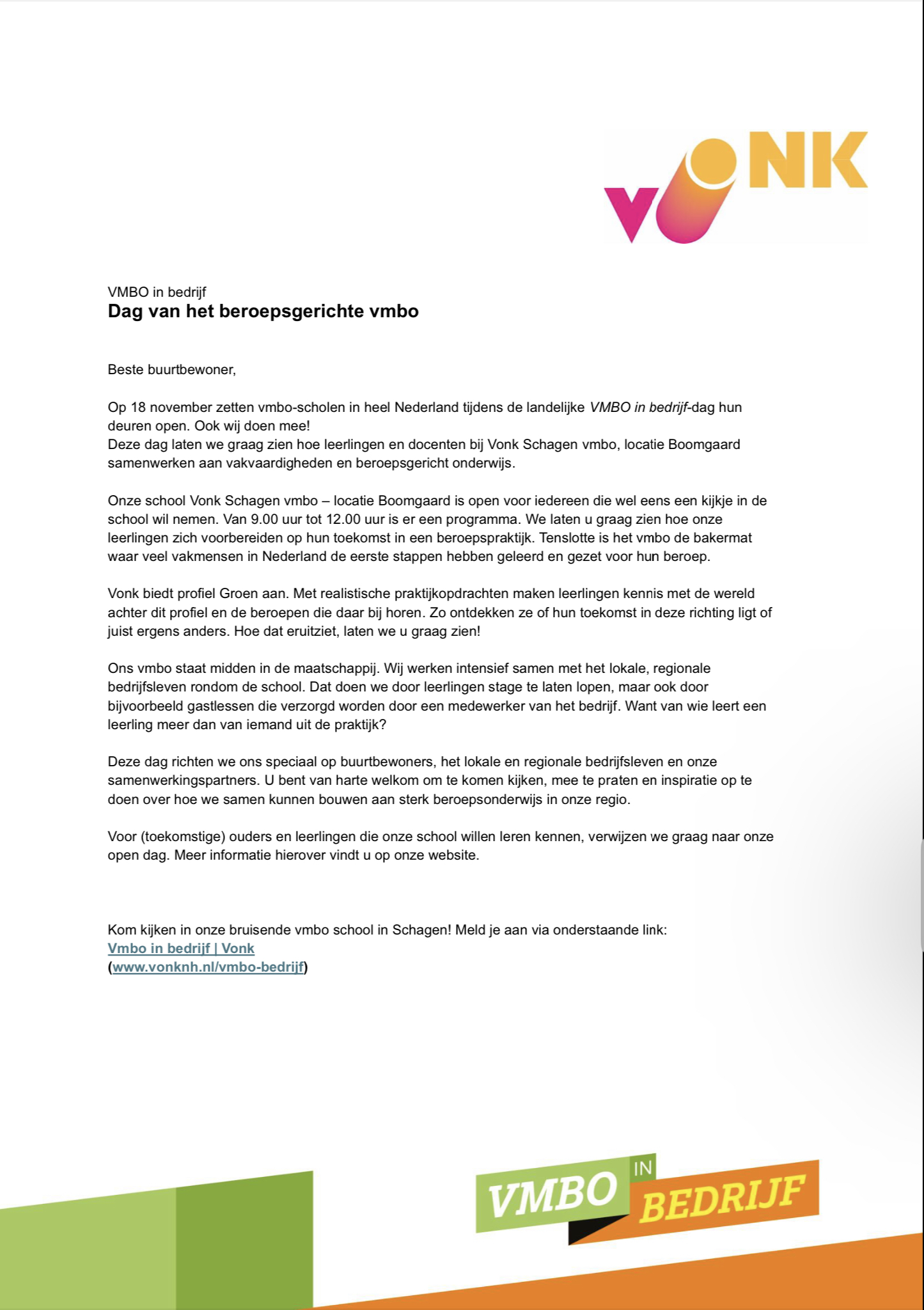 Altijd al eens een kijkje willen nemen in de school die midden in onze wijk staat? Dit is uw kans! U bent van harte welkom op 18 november tussen 09.00 en 12.00 uur. Aanmelden kan via deze link: Vmbo in bedrijf | Vonk
